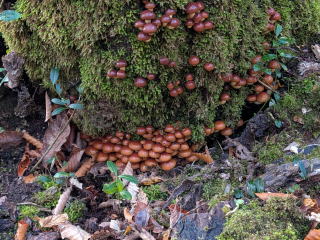 | (画像A) まだ小さいですがナメコタワー。 | (画像B) 根元に大きなものが。 | |